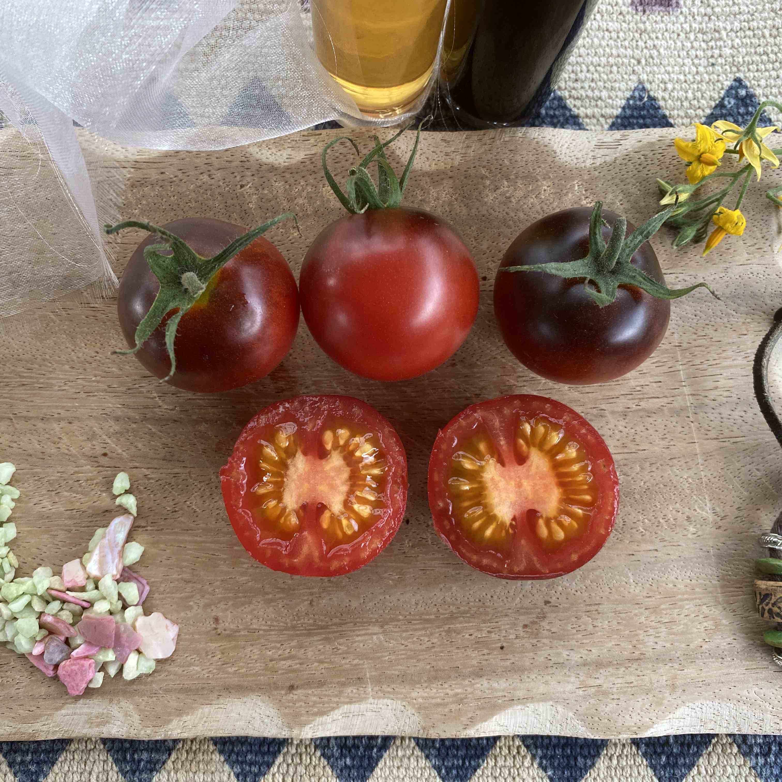 Phantastische Cherrytomate. Die rote Sorte hat einen leichten, schwarzen "Nebel" auf der "Schulter". Saftig-süsse Verführung!